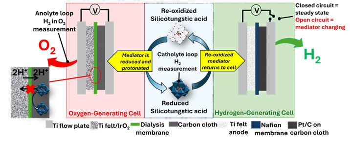 105. “Solution-phase decoupled water electrolysis in a flow cell with a simple size exclusion membrane separator”