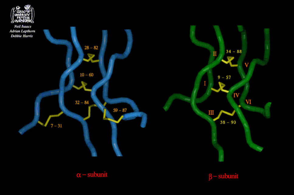 With the correct disulphide assignments it became apparent that both the alpha and beta subunits had an unusual "knot" of cystines. This unusual feature has been seen in a number of protein growth factors namely Nerve growth factor, Platelet derived growth factor BB and Transforming growth factor B. The cystine knot comprises three disulphide bridges, arranged so that two disulphides link adjacent parallel strands of the peptide chain and form a ring through which the third disulphide penetrates.