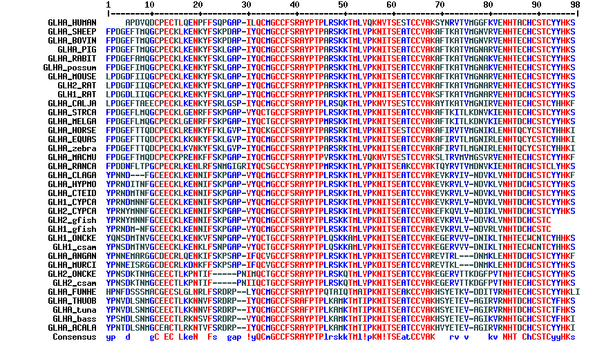 GLHA_HUMAN (P01215) GLYCOPROTEIN HORMONES ALPHA CHAIN HOMO SAPIENS (HUMAN) GLHA_MACMA (P22762) GLYCOPROTEIN HORMONES ALPHA CHAIN MACACA MULATTA (RHESUS MACAQUE) GLHA_BOVIN (P01217) GLYCOPROTEIN HORMONES ALPHA CHAIN BOS TAURUS (BOVINE) GLHA_PORCI (P01219) GLYCOPROTEIN HORMONES ALPHA CHAIN SUS SCROFA (PIG) GLHA_SHEEP (P01218) GLYCOPROTEIN HORMONES ALPHA CHAIN OVIS ARIES (SHEEP) GLHA_HORSE (P01220) GLYCOPROTEIN HORMONES ALPHA CHAIN EQUUS CABALLUS (HORSE) GLHA_EQUAS (Q28365) GLYCOPROTEIN HORMONES ALPHA CHAIN EQUUS ASINUS (DONKEY) GLHA_BALAC (P37036) GLYCOPROTEIN HORMONES ALPHA CHAIN BALAENOPTERA ACUTOROSTRATA (MINKE WHALE) GLHA_PHYCA (P25329) GLYCOPROTEIN HORMONES ALPHA CHAIN PHYSETER CATODON (SPERM WHALE) GLHA_MOUSE (P01216) GLYCOPROTEIN HORMONES ALPHA CHAIN MUS MUSCULUS (MOUSE) GLH1_RAT (P11962) GLYCOPROTEIN HORMONES ALPHA CHAIN 1 PRECURSOR RATTUS NORVEGICUS (RAT) GLH2_RAT (P11963) GLYCOPROTEIN HORMONES ALPHA CHAIN 2 PRECURSOR RATTUS NORVEGICUS (RAT) GLHA_RABIT (P07474) GLYCOPROTEIN HORMONES ALPHA CHAIN ORYCTOLAGUS CUNICULUS (RABBIT) GLHA_RANCA (P80051) GLYCOPROTEIN HORMONES ALPHA CHAIN RANA CATESBEIANA (BULL FROG) GLHA_ACALA (P30970) GLYCOPROTEIN HORMONES ALPHA CHAIN ACANTHOPHAGRUS LATUS (YELLOWFIN PORGY) GLHA_ANGAN (P27794) GLYCOPROTEIN HORMONES ALPHA CHAIN ANGUILLA ANGUILLA (EUROPEAN FRESHWATER EEL) GLHA_CTEID (P30983) GLYCOPROTEIN HORMONES ALPHA CHAIN CTENOPHARYNGODON IDELLA (GRASS CARP) GLHA_MURCI (P12836) GLYCOPROTEIN HORMONES ALPHA CHAIN MURAENESOX CINEREUS (PIKE EEL) (DAGGERTOOTH PIKE CONGER) GLHA_MELGA (P37035) GLYCOPROTEIN HORMONES ALPHA CHAIN MELEAGRIS GALLOPAVO (COMMON TURKEY), AND COTURNIX COTURNIX JAPONICA (JAPANESE QUAIL) GLH1_CYPCA (P01221) GLYCOPROTEIN HORMONES ALPHA CHAIN 1 PRECURSOR CYPRINUS CARPIO (COMMON CARP) GLH2_CYPCA (P18857) GLYCOPROTEIN HORMONES ALPHA CHAIN 2 PRECURSOR CYPRINUS CARPIO (COMMON CARP) GLH1_ONCKE (P13152) GLYCOPROTEIN HORMONES ALPHA CHAIN 1 PRECURSOR ONCORHYNCHUS KETA (CHUM SALMON) GLH2_ONCKE (P13153) GLYCOPROTEIN HORMONES ALPHA CHAIN 2 PRECURSOR ONCORHYNCHUS KETA (CHUM SALMON) GLHA_STRCA (P80665) GLYCOPROTEIN HORMONES ALPHA CHAIN PRECURSOR STRUTHIO CAMELUS (OSTRICH) GLHA_THUOB (P37204) GLYCOPROTEIN HORMONES ALPHA CHAIN PRECURSOR THUNNUS OBESUS (BIGEYE TUNA) GLHA_CLAGA (P53542) GLYCOPROTEIN HORMONES ALPHA CHAIN PRECURSOR CLARIAS GARIEPINUS (SHARPTOOTH CATFISH) GLHA_HYPMO (P37037) GLYCOPROTEIN HORMONES ALPHA CHAIN PRECURSOR HYPOPHTHALMICHTHYS MOLITRIX (SILVER CARP) GLHA_FUNHE (P47744) GLYCOPROTEIN HORMONES ALPHA CHAIN PRECURSOR FUNDULUS HETEROCLITUS (KILLIFISH) GLHA_zebra (g2828334) glycoprotein hormone alpha subunit Equus burchelli (common zebra) GLH1_csam (g2133952) glycoprotein hormone alpha subunit 1 Oncorhynchus masou (cherry salmon) GLH2_csam (g2133953) glycoprotein hormone alpha subunit 2 Oncorhynchus masou (cherry salmon) GLH1_gfish (g1469836) glycoprotein hormone alpha subunit 1 Carassius auratus (goldfish) GLH2_gfish (g1469838) glycoprotein hormone alpha subunit 2 Carassius auratus (goldfish) GLHA_bass (g2147428) glycoprotein hormone alpha subunit Morone saxatilis (striped bass) GLHA_tuna (g298264) glycoprotein hormone alpha subunit Euthynnus pelamis (skipjack tuna) GLHA_hamst (g1150542) glycoprotein hormone alpha subunit Phodopus sungorus (striped hairy-footed hamster) GLHA_camel (g226540) glycoprotein hormone alpha subunit (fragment) Camelus dromedarius (Arabian camel)