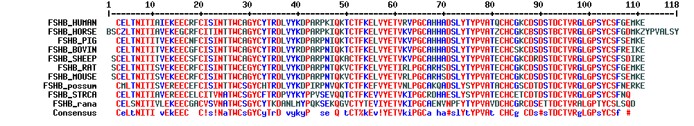 FSHB_HUMAN (P01225) FOLLITROPIN BETA CHAIN PRECURSOR (FSH-B) HOMO SAPIENS (HUMAN) FSHB_PIG (P01228) FOLLITROPIN BETA CHAIN PRECURSOR (FSH-B) SUS SCROFA (PIG) FSHB_BOVIN (P04837) FOLLITROPIN BETA CHAIN PRECURSOR (FSH-B) BOS TAURUS (BOVINE) FSHB_SHEEP (P01227) FOLLITROPIN BETA CHAIN PRECURSOR (FSH-B) OVIS ARIES (SHEEP) FSHB_HORSE (P01226) FOLLITROPIN BETA CHAIN (FSH-B) EQUUS CABALLUS (HORSE) FSHB_RAT (P18427) FOLLITROPIN BETA CHAIN PRECURSOR (FSH-B) RATTUS NORVEGICUS (RAT) FSHB_MOUSE (Q60687) FOLLITROPIN BETA CHAIN PRECURSOR (FSH-B) MUS MUSCULUS (MOUSE) FSHB_STRCA (P80663) FOLLITROPIN BETA CHAIN PRECURSOR (FSH-B) STRUTHIO CAMELUS (OSTRICH) FSHB_possum (g2738515) follicle stimulating hormone beta subunit Trichosurus vulpecula (Brushtail Possum) FSHB_rana (g259873) follicle stimulating hormone beta subunit Rana catesbeiana (bullfrog)