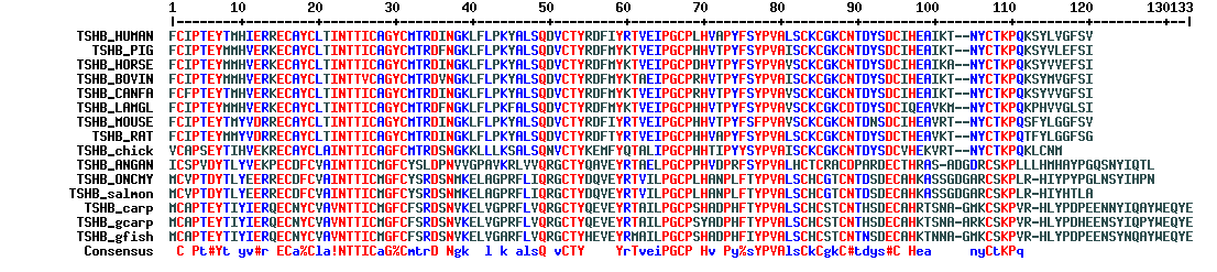 TSHB_HUMAN (P01222) THYROTROPIN BETA CHAIN PRECURSOR HOMO SAPIENS (HUMAN) TSHB_PIG (P01224) THYROTROPIN BETA CHAIN PRECURSOR SUS SCROFA (PIG) TSHB_MOUSE (P12656) THYROTROPIN BETA CHAIN PRECURSOR MUS MUSCULUS (MOUSE) TSHB_BOVIN (P01223) THYROTROPIN BETA CHAIN PRECURSOR BOS TAURUS (BOVINE) TSHB_RAT (P04652) THYROTROPIN BETA CHAIN PRECURSOR RATTUS NORVEGICUS (RAT) TSHB_HORSE (Q28376) THYROTROPIN BETA CHAIN PRECURSOR EQUUS CABALLUS (HORSE) TSHB_LAMGL (P79357) THYROTROPIN BETA CHAIN PRECURSOR LAMA GLAMA (LLAMA) TSHB_CANFA (P54828) THYROTROPIN BETA CHAIN PRECURSOR CANIS FAMILIARIS (DOG) TSHB_ANGAN (Q08127) THYROTROPIN BETA CHAIN PRECURSOR ANGUILLA ANGUILLA (EUROPEAN FRESHWATER EEL) TSHB_ONCMY (P37240) THYROTROPIN BETA CHAIN PRECURSOR ONCORHYNCHUS MYKISS (RAINBOW TROUT) TSHB_salmon (g3091282) thyrotropin beta subunit Salmo salar (Atlantic salmon) TSHB_chick (g2660745) thyrotropin beta subunit Gallus gallus chicken TSHB_ccarp (g2114100) thyrotropin beta subunit Cyprinus carpio (common carp) TSHB_gcarp (g2114102) thyrotropin beta subunit Ctenopharyngodon idella (grass carp) TSHB_gfish (g2114098) thyrotropin beta subunit Carassius auratus (goldfish) TSHB_hamst (g1150544) thyrotropin beta subunit (frag) Phodopus sungorus (striped hairy-footed hamster)
